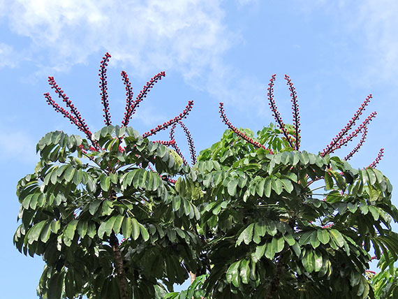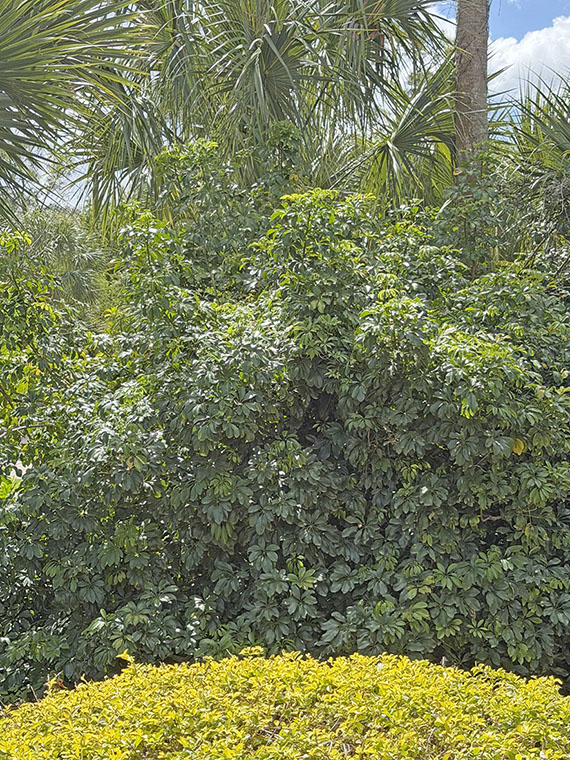 While the species is not mentioned, there is evidence that the Seminole Lodge aralias were Japanese or Queensland Umbrella Trees, Heptapleurum actinophylum. The Umbrella Tree is noted in a 1918 photograph capturing the wedding day of Charles Edison at Seminole Lodge. This would be consistent with the popularity of Japanese plants that captured the nursery industry in the 1920s. We still find them popping up in random spots in the gardens – especially in and around the bamboo stands, so it’s no wonder this plant ended up on the list of invasive species in Florida.